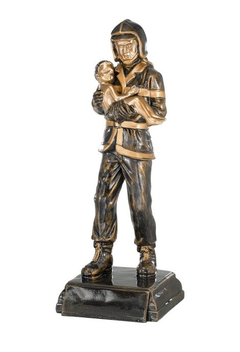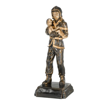 En promotion : Sapeur-Pompier tenant un Enfant monté sur un socle carré, Sculpture en résine façon bronze